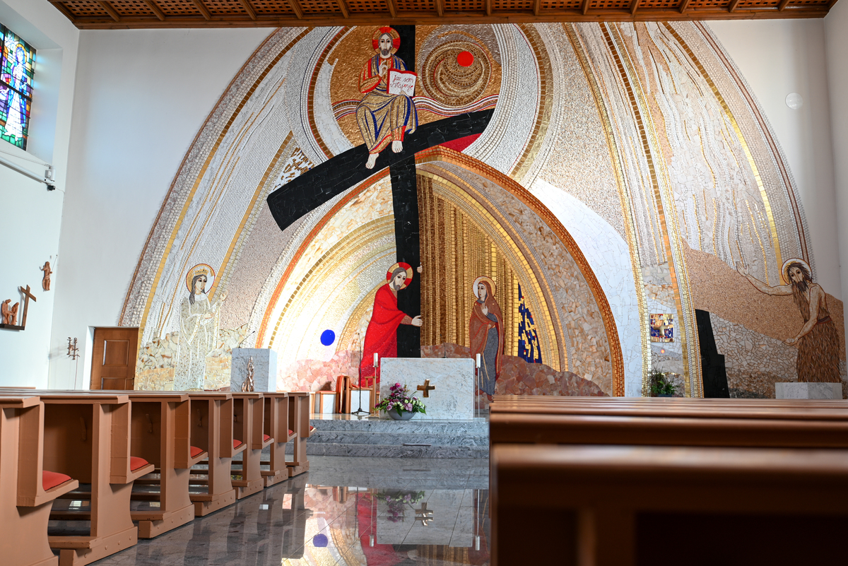 Notranjost cerkve je svojo končno podobo dobila leta 2009, ko je bil po zamisli patra Marka Ivana Rupnika celoten prezbiterij prenovljen. Nastali so novi oltar, ambon, krstilnik, tabernakelj in stopnišče, ki skupaj z izjemnim mozaikom tvorijo celoto z globokim verskim in simbolnim sporočilom.